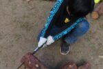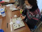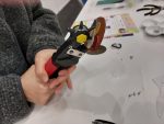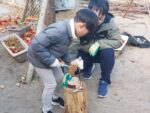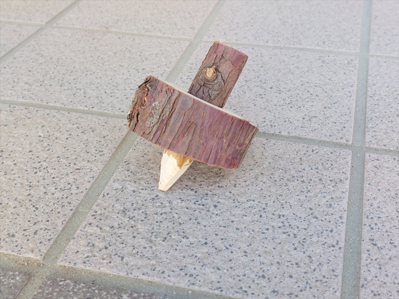 トラちゃんが突然「コマを作ろう」と言い出し、輪切りにした木の皮をノミで剥いてドリルで穴を開けた。さらにその穴にまっすぐな枝を刺してコマを完成させた。子どもたちもコマを作りたくなった。