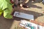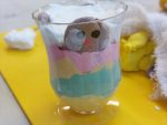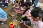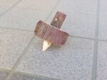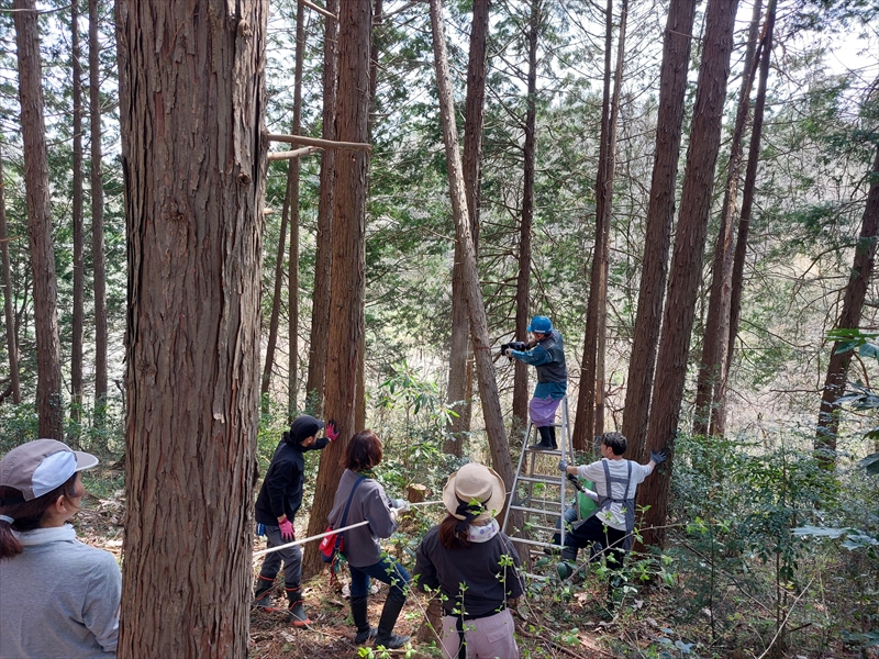 桧の輪切りや皮剥ぎ遊びが更にヒートアップした。コマ作りとは別に太い丸太の皮むきに集中する子どもや釘と小枝を使ったオブジェ(本人はエレベーターといっていた)を作る子どももいた。午後の活動では遊びが各自の興味へと分かれていった。子どもが自分でやりたいことを見つけやってみる、そういう活動となった。