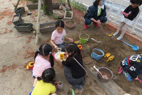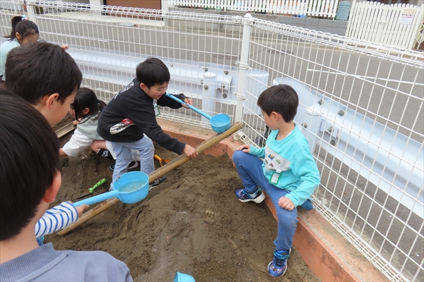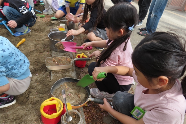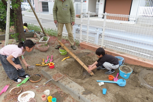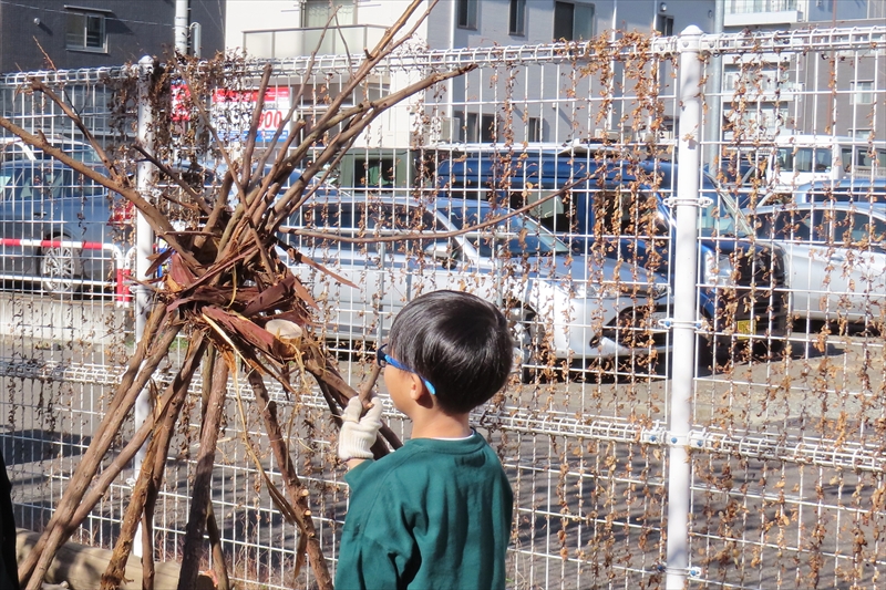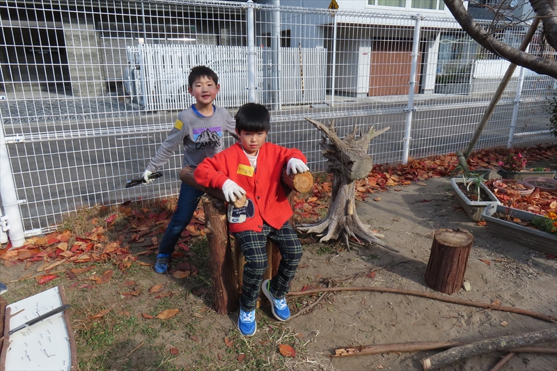 その様子を見て廃材の板を切り、丸太と組み合わせてイスを作った子どももいた。アイディアが子ども同士で共有され、遊びが広がるのを実感した。職員が木の枝を組み合わせ小屋状のものを作ったら、さっそく子どもが輪切りにした桧を飾り、嬉しそうにその小屋に入っていった。秘密基地遊びを想像したのかもしれない。