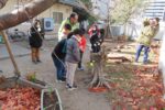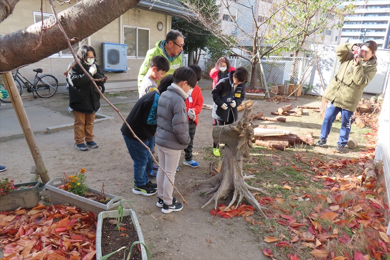 ノコギリが初めてという子どもたちには使い方を教えてから大人の見守りの中で木を切らせた。枝を見せて「これ切るか?」と言うと「大きいの切りたい。」1年生でも返ってくる答えは同じだった。