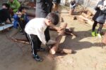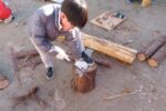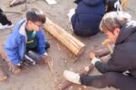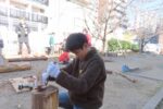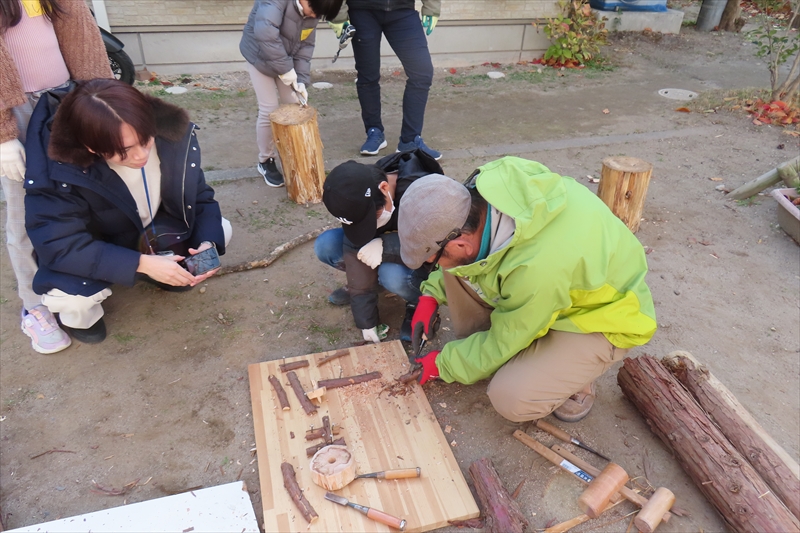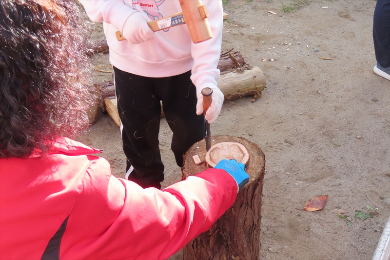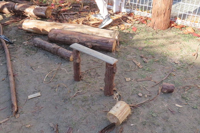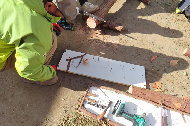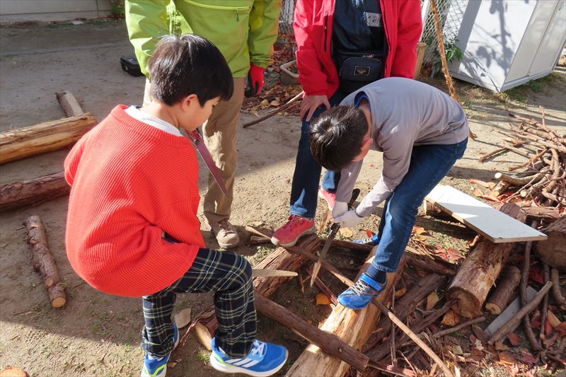 大人の助けを借りながらも丸太を切り終えたときの子どもたちの充実感や満足感を体中から感じることができた。前回も参加した子どもたちは遊びに進化が見られた。パチンコ台に障害物を追加したり、丸太を組み合わせ、五寸釘を打ってマイチェアを作った子どもがいた。