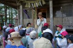 児童館の子どもたちが坪沼に到着し、川辺の道から石段を登って境内へ登った。秋の気候に近づき、カエルは少なくなったが、バッタやトンボはたくさん見られ、道中も虫を追いかけたり草むらに足を止める姿が見られた。