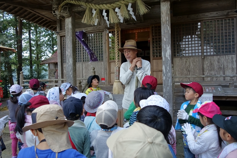子どもたちは坪沼神社の裏参道のきつい坂道を元気に上って、トイレを済ませるとすぐに昼食を取った。境内に敷かれたブルーシートに座り、秋の空気を感じながら食べたせいか、どの子も食事を終えるのが早かった。