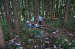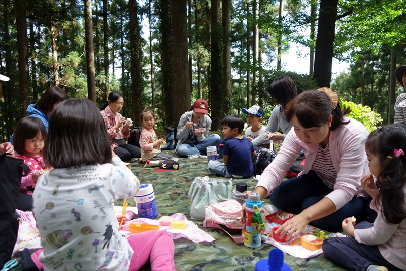 午後から活動するヒノキ林を下見した後、昼食の為に社務所に戻った。晴れていたので広場にシートを敷き外で昼食をとることになった。後から出発したとっとくらぶの親子が到着し、児童館とトットクラブ全員で一緒に昼食の時間となった。SOATスタッフや職員を交えて、子どもたちは楽し気に会話をしながらお弁当を食べ終えた。
