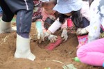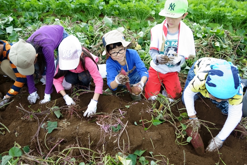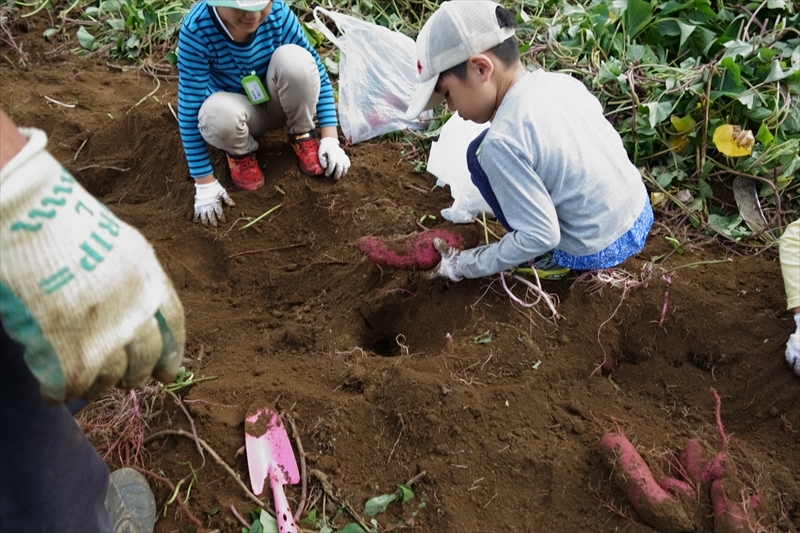 40分ほど遊んでから畑に移動した。そこには芋が掘りやすいようにして農家の方が待っていてくれた。お母さんと一緒に土の中に手を入れると、とびきり大きなサツマイモがごろごろ出てきて、みんな大喜びだった。