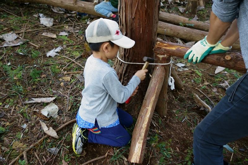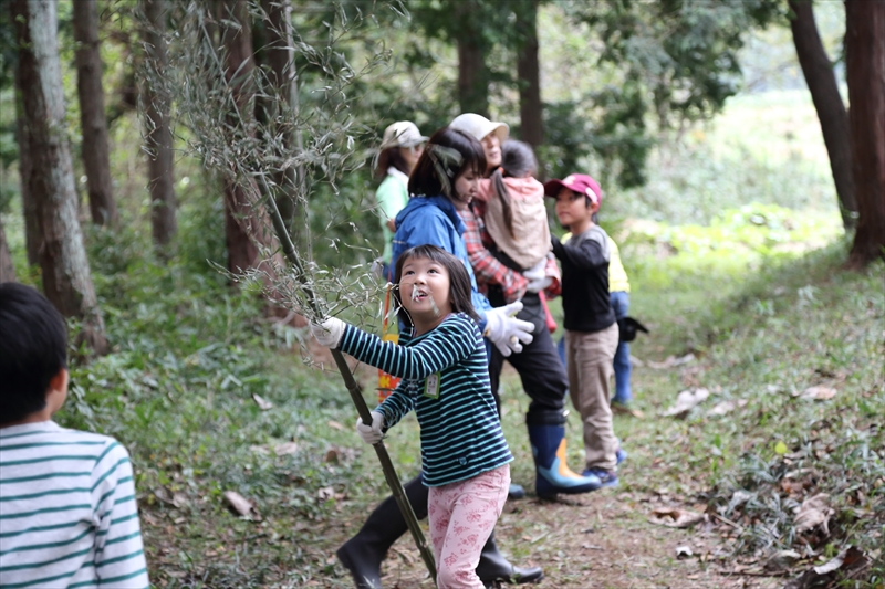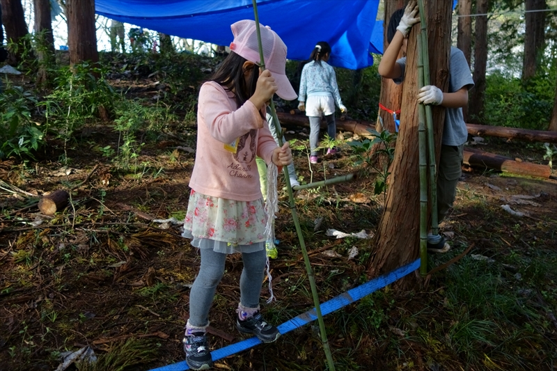 午後からはとっとくらぶが先にサツマイモ掘りへ出発し、児童館の子どもたちは自分たちのサツマイモ掘りまでヒノキ林で活動を開始した。木の遊具にはすぐに子どもたちが集まり遊び始めた。ツリーハウスで遊んでいた男の子に呼ばれて行くと、「ツリーハウスの下は秘密基地なんだよ。」と説明してくれた。子どもたちは自分たちで材料を見つけ工夫しながら遊んでいた。丸太渡りを更に長くしようと齋さんが動き始めると、何人かの子どもたちが率先して手伝いはじめ、大きくて重い丸太に紐をかけてみんなで声を合わせながら動かした。とても重い丸太だったので苦労したようだったがうまく運び終わると「やったー。」と嬉しそうに拍手をした。