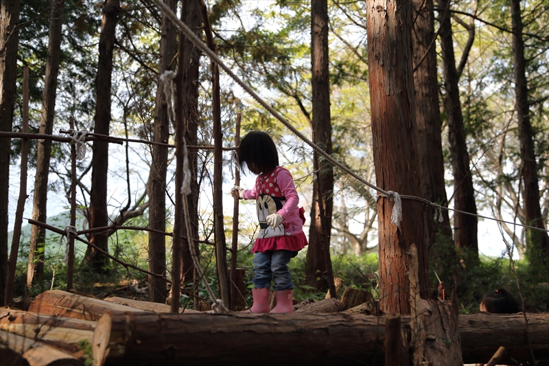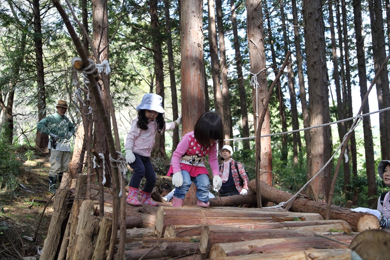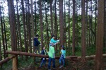 しばらく食後の休憩を取り、1時からはヒノキ林に出かけ、保護者と一緒に木製アスレチックで遊んだ。櫓(やぐら)のように組まれた木材を見た保護者は子どもたちが作ったと聞いて驚いていた。「倒れるぞーという活動を行って、木を倒すところから始めました。それを子どもたちがノコギリで切ったり、釘を打ったりして作りました。」説明を聞いたお母さん方は驚いた様子だった。子どもたちはこわごわ櫓の上を歩いたり、長い一本橋を渡ったりして楽しんだ。ブランコもあるよ、と言うと一斉に「ブランコ、ブランコ。」と林の斜面を駆け上がっていった。また、木登りもできるよ、というと子供と一緒になって木登りを始める保護者もいた。子どもも大人も関係なく林の中の自然を気に入ったようだった。