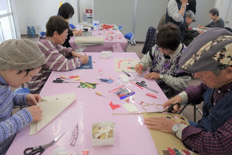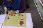 作り方の手順やボンドの扱い方を説明。まずばキットにしていたツリーをマットに貼っる作業。その後はそれぞれに工夫して布を切り、マットに並べて布用ボンドで貼りつけオリジナルのクリスマスランチョンマットに仕上げていきました。