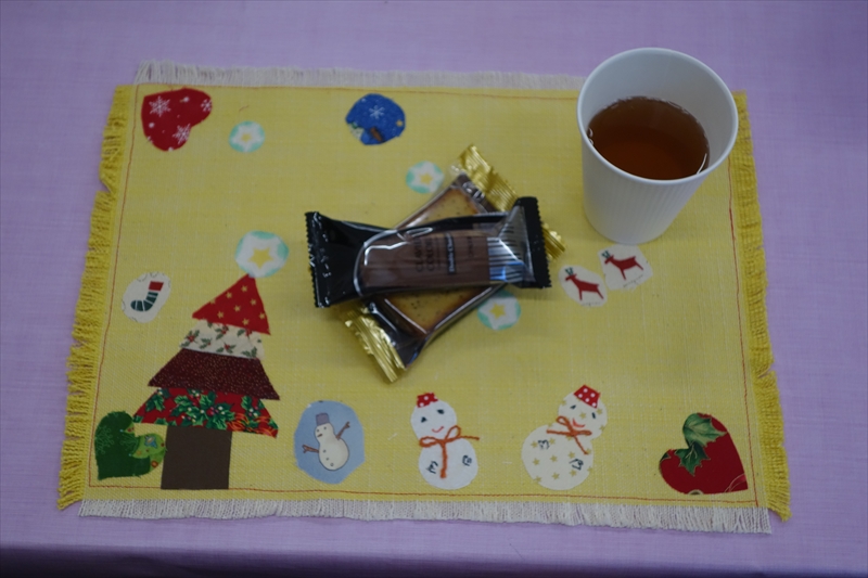 完成したクリスマスランチョンマットを使いお茶っこタイム。