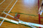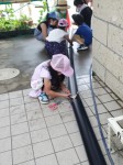 一人2,3分の活動(2回繰り返し)だったが、5メートル近い大きな布に体全体を使って描く経験などなかったので、子どもたちは十分満足できたようだ。大きな絵が完成した直後、不思議な行動が見られた。子どもたちがぐるぐる絵の上を回り始めたのだ。それも左右両方のテントで始まったのだ。知らない人が見たら何かの儀式だ。下を向いて作品を見ながら歩くのだ。理由を聞くと「ヌルヌルして気持ちいいから。」視覚的な遊びだけではなく触覚も使った遊びを発見したようだ。子どもたちにとって今日のワークショップは楽しみ尽せる内容だったようだ。