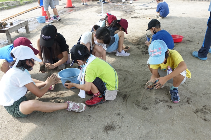 今回も3蜜を避けるため、外での活動とした。30度超えの午後の活動ということで熱中症対策のテントを3張り準備してスタートとした。簡単な準備運動を行い、描き方の説明と待つ順番などについて説明を行い、その後4年生による布へのデモンストレーションがあった。何も描かれていない大きな布にスー、スーと気持ちよさそうに線を描いた。その様子を見ていた1年生は早く自分もやってみたいという顔つきだった。先輩によるデモンストレーションは見事に成功した。