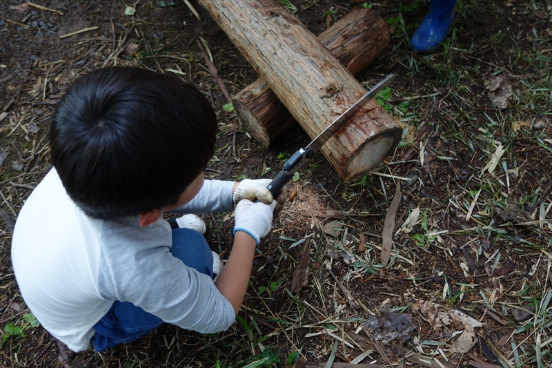 できたての雨具を羽織った子も一緒にみんなで林や畑の道を抜けて、根添舘の城跡を経由し、神社の境内をぐるりと周って探検した。ヒノキ林に着くと、齋じいと一緒に見張り台を作ったり、木登りや丸太渡り、ひみつ基地作りなど、それぞれがやりたい事に自由に取り組んだ。見守り隊として同行した保護者の一人が枝とロープで弓矢を作ったのを見た子ども達は「いいなぁ、欲しい!」と言って一部で弓矢作りブームが起きた。枝の先を削るところも「自分でやってみたい。」という子どもにはナイフや鉈の使い方を教えた。「昔はこうやってナイフで鉛筆を削ってたんだよ。」と教えると、「へぇ~。大変だね。」と驚いていた。