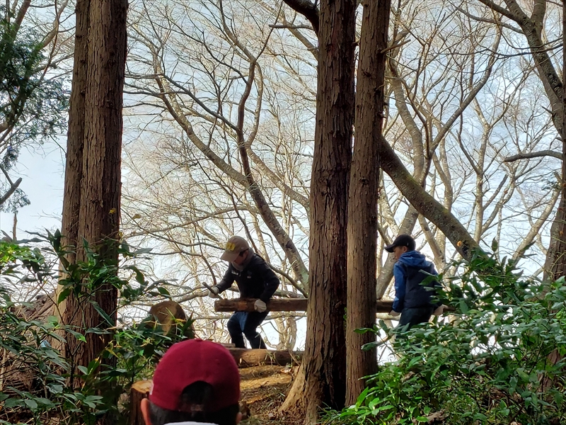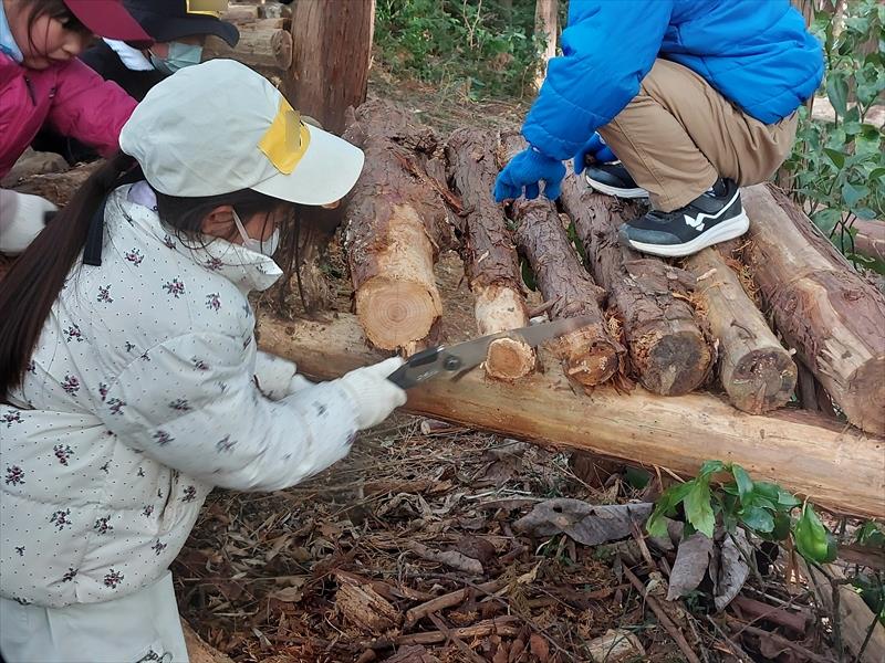 新しく掛けたターザンロープでは足を乗せるロープを体に巻き付けると楽で面白いことを発見した女子がいた。それをまねてもうまくいかないともだちには順番待ちの子どもたちが手伝ったり、木材運びや切った長い竹の移動など、いろいろな場面で協力する姿を見ることができた。