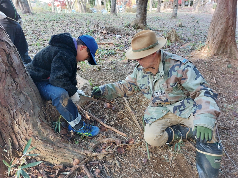 齋じいは子どものヘルプ役として動き、トラちゃんは一部の「ものを作りたい」という子どもにノミを使った枝の皮むきを教えた。