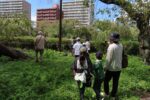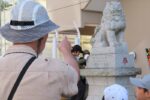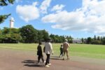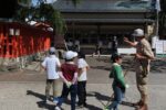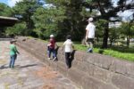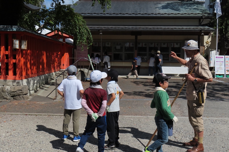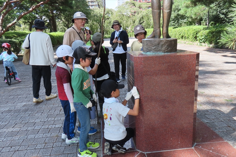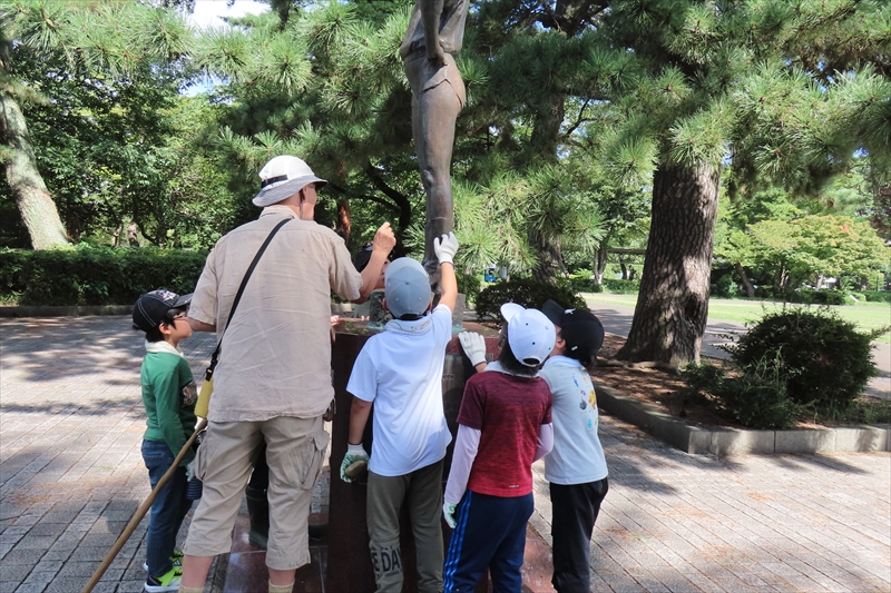 子どもたちは目を輝かせて植え込みの中をすり抜けた。探検途中で齋じいは公園に配置されている2体のブロンズ像の作り方を説明したり、歴史民俗資料館に立ち寄ったりした。