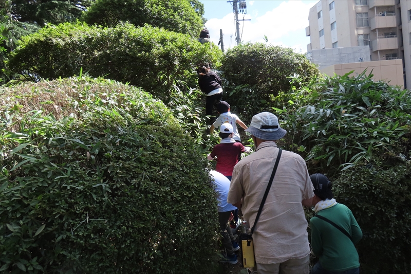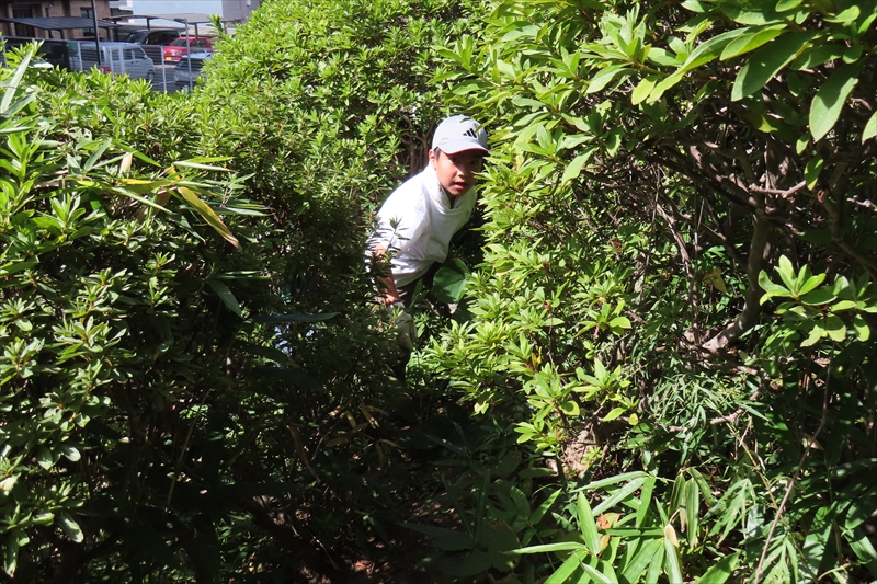 齋じいは神社脇手の駐車場から探検を始めた。この隙間は通れるか、と子どもに聞いたり、公園では植え込みの隙間を見つけてはくぐり抜け、いつも目にする公園がジャングルと化した。