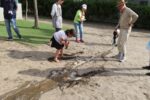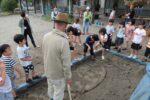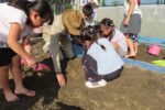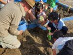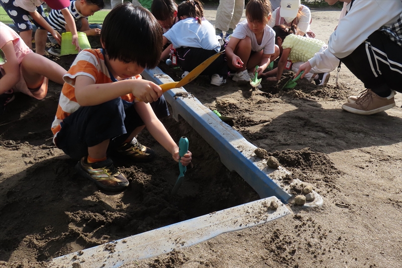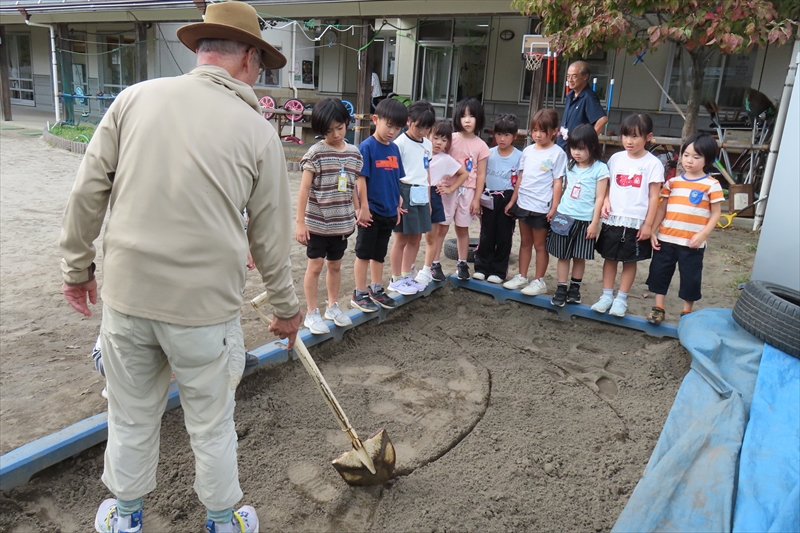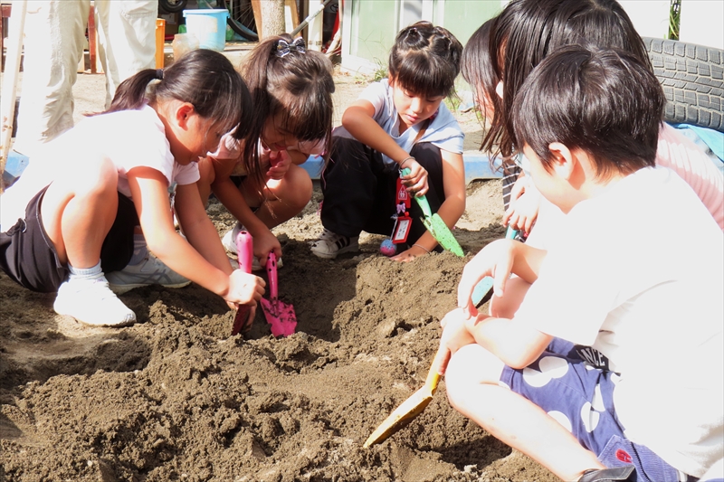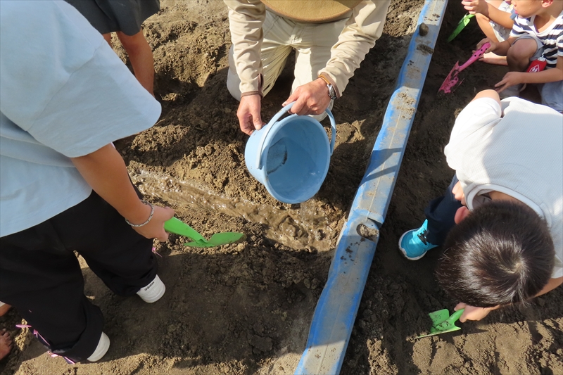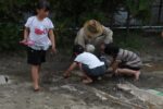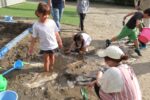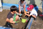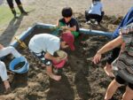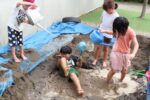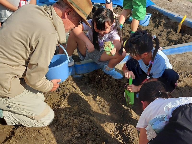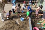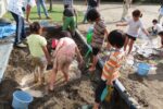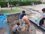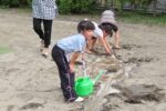 裸足になってもいいよ、といわれて何人か裸足になり「気持ちいい」と喜んだが、コロナ禍以降子どもたちは土や砂などに触れて遊ぶ経験が少なくなったようだ。子どもたちが砂を掘る様子を見て齋じいは活動内容を砂+水遊びに変更した。