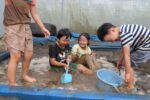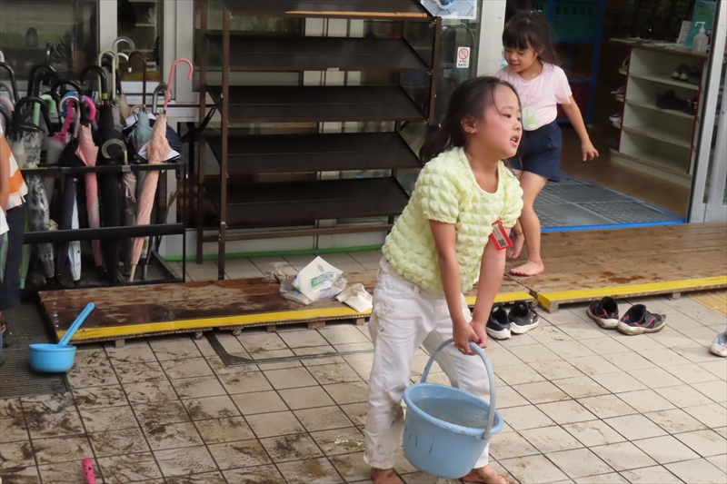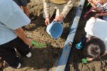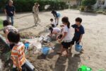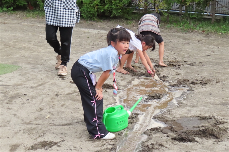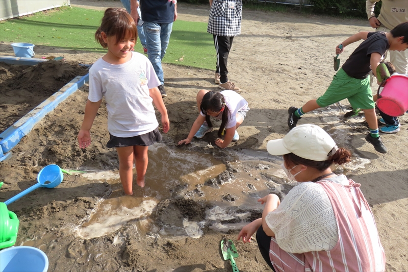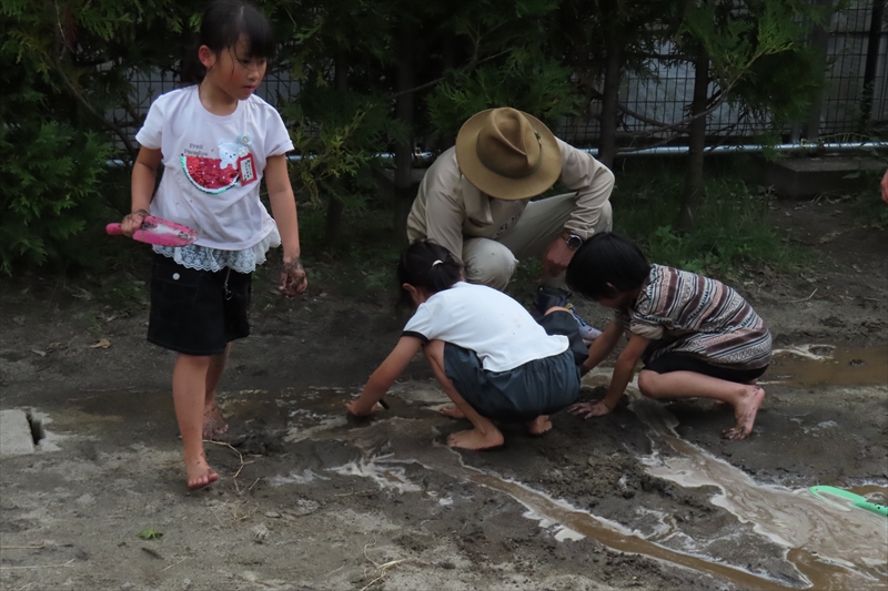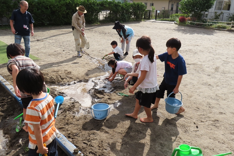 館庭に川を作り、掘った穴を池にして水を流した。すると子どもたちの心のスイッチが入った。バケツやじょうろで水を汲み、池を作ったり何度も川に水を流し入れ、館庭の端まで川の水を流そうと挑戦した。裸足で池に入る子どもが出てきて、いつの間にか池に下半身を沈めたり、泥水を体にかけ始めたり。