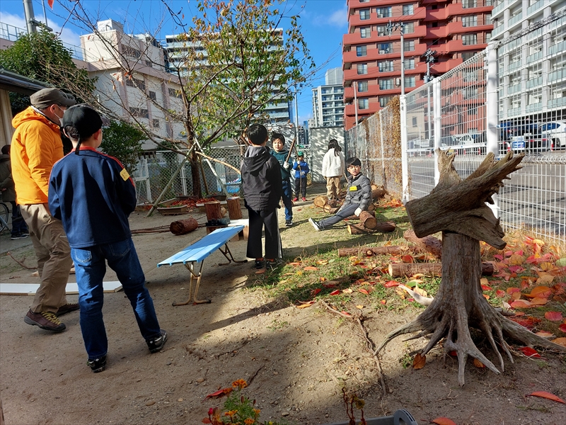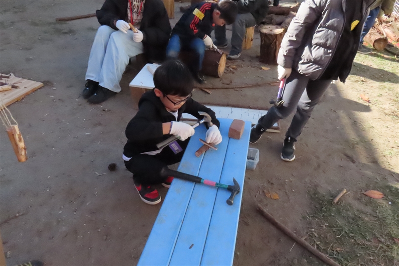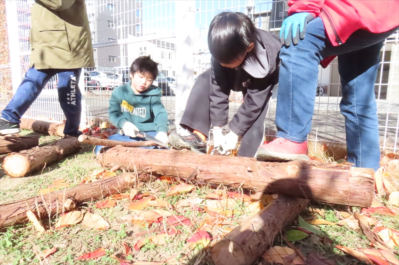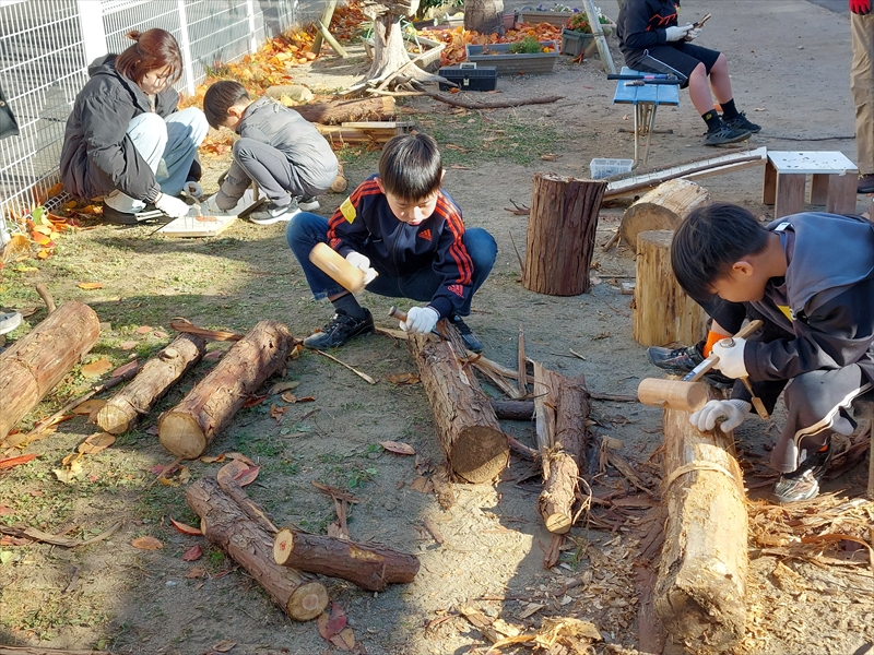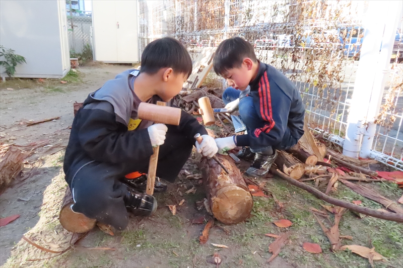丸太を切ったり、ノミを使ったりという経験は学校ではできないのでなおさら楽しかったに違いない。