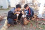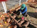 ノコギリを見つけた1年生はトラちゃんから使い方を教わり、ノコギリで丸太を切り始めた。「引いて切るノコギリは日本だけ。外国は押して切るんだよ。」ミニ知識も学んだ。廃棄予定の合板もあった。