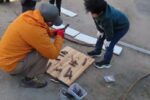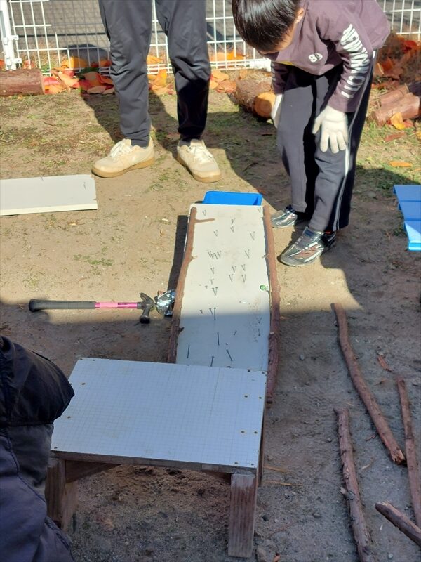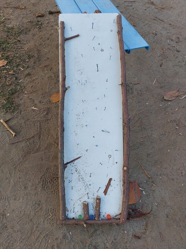 「自由に釘を打ったら面白いパチンコ台になりそう」というと何人かが集まって釘打ちが始まった。「ゴールはここにしよう」、「台から落ちたら0点。ゴールに入ったら3点」釘打ちが終わると早速ビー玉を転がして遊び始めた。ゴールのすぐ手前に釘を打つ子がいた。大人は思わず「そこに釘打ったら玉が入らないんじゃないの?」と心配した。
