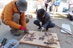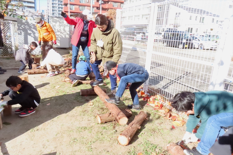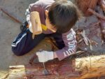 午後も引き続き参加した子どもはノミと木槌を使って丸太の皮むきを体験した。その姿はまるで大工さんの雰囲気だった。