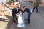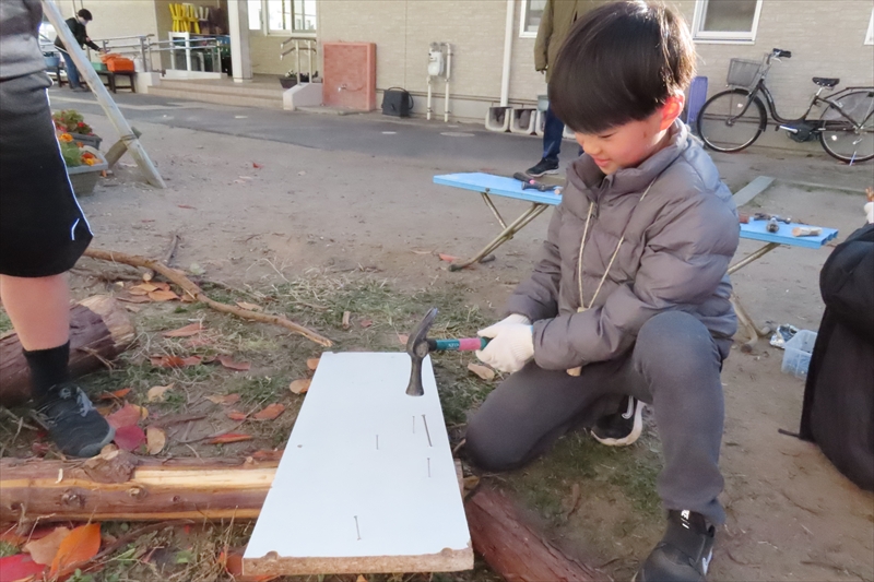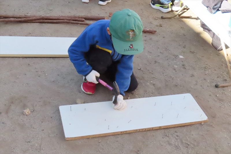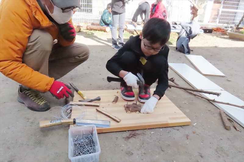男子がビー玉3個を無造作に転がしたらそのうちの2個が入った。大人の常識で子どもの自由な感性を危うく奪うところだった。子どもたちはトラちゃんからノミの扱いを教えてもらって桧の枝の皮むきを体験したり、合板に小枝を打ってアート作品を作ったりした。
