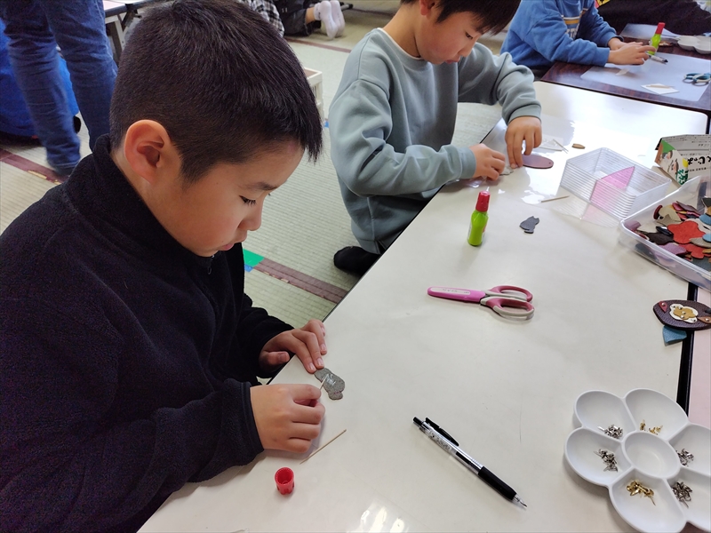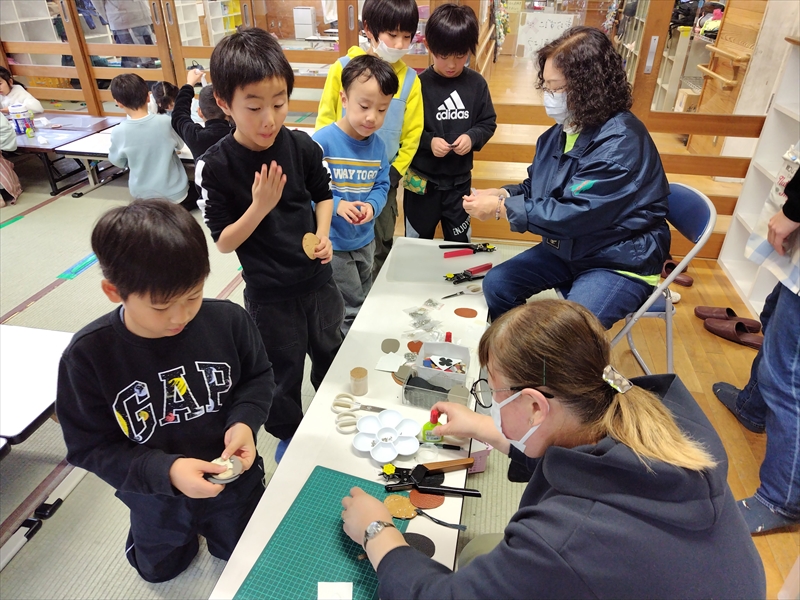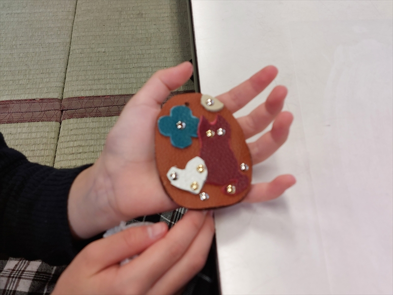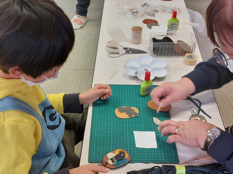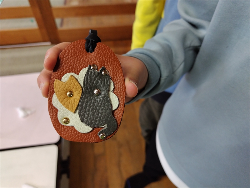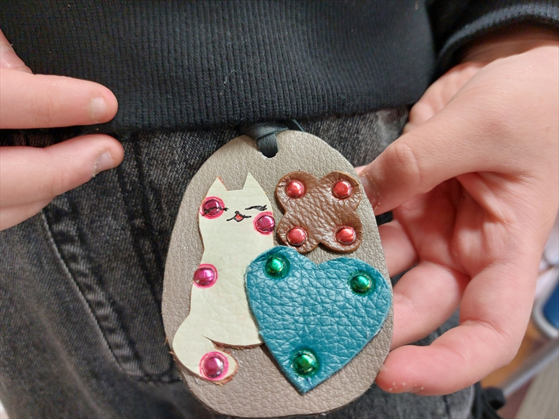 さっそく腰にぶら下げたり、作ったばかりのキーホルダーを友だち同士見せ合って喜んでいた。どの子も自信作ができあがり満足そうにワークショップを終えることができた。
