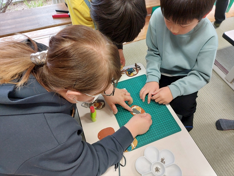 子どもによっては自分でレザーを切って形を作る子もいた。どの子も意欲満々で集中力の高さには驚いた。