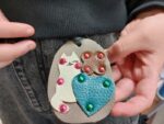大人のワークショップと違い、子どもでも安全にスタッズを付けられるよう、割ピンを用意した。穴に割ピンの足を通して足を広げてスタッズ装飾は完成した。