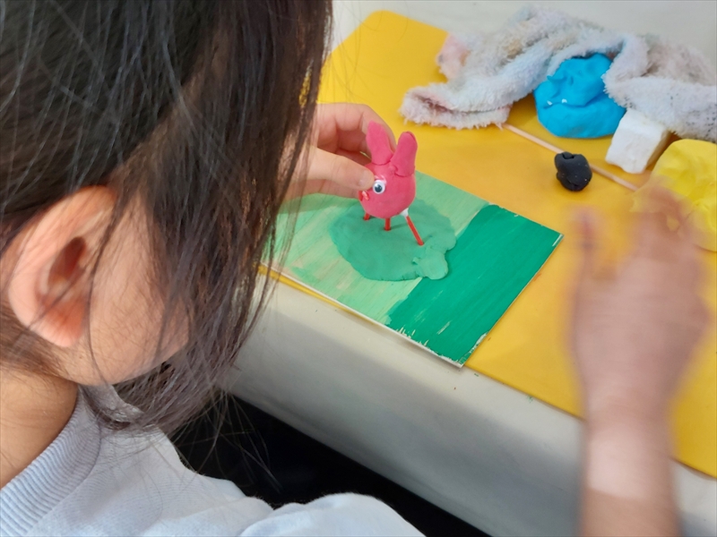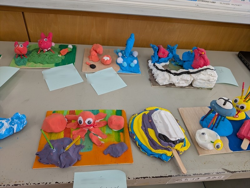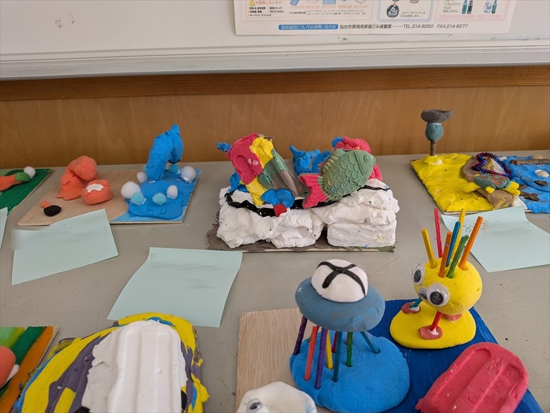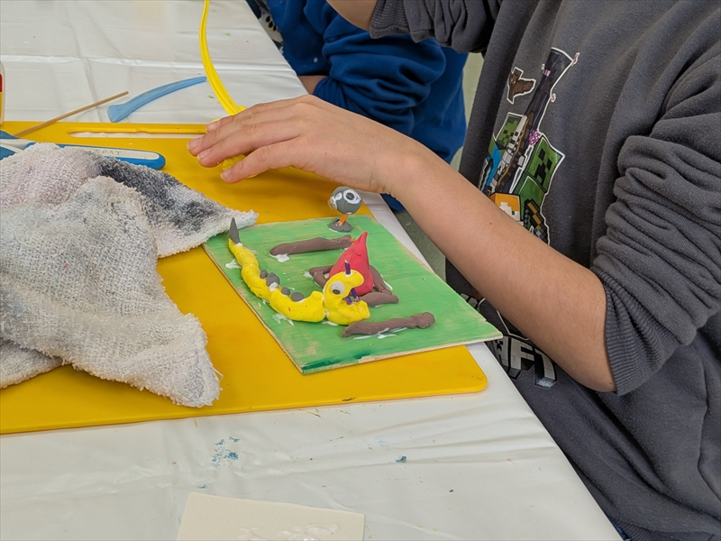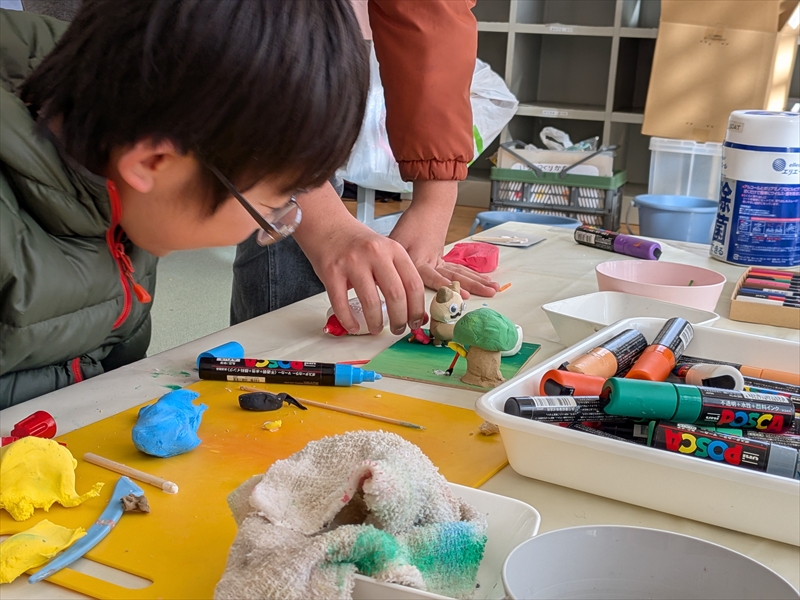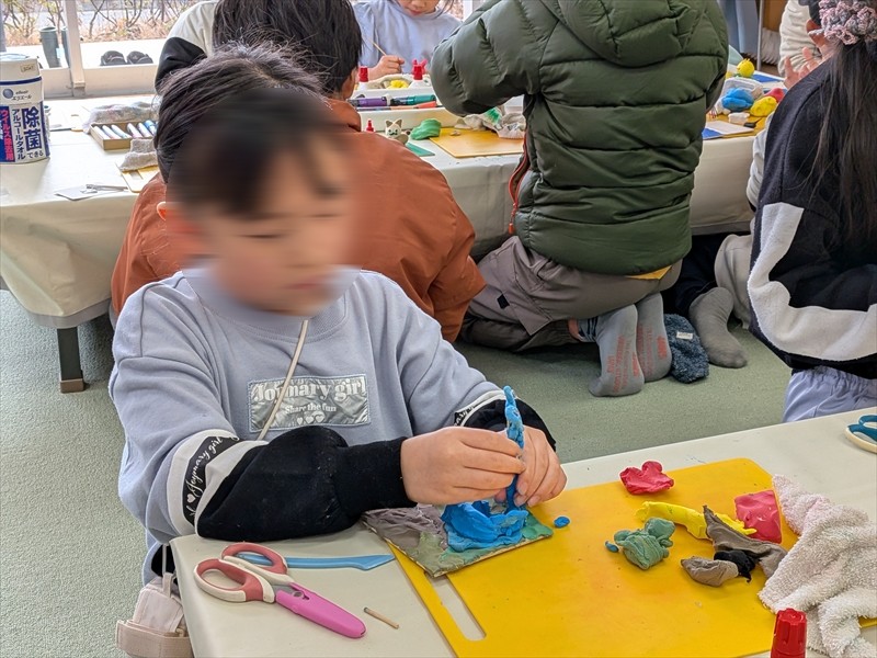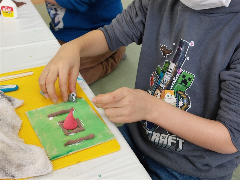 講師から「紙粘土をたくさん使って大きなものを作ってもいいよ」と言われ、土台の板からはみ出すのではないかと思うような大きな生物を作る子ども現れた。