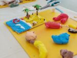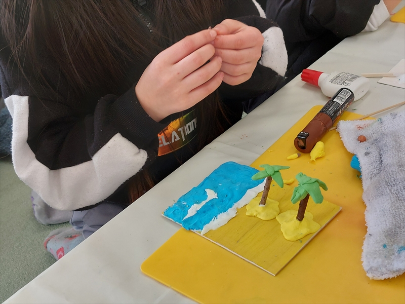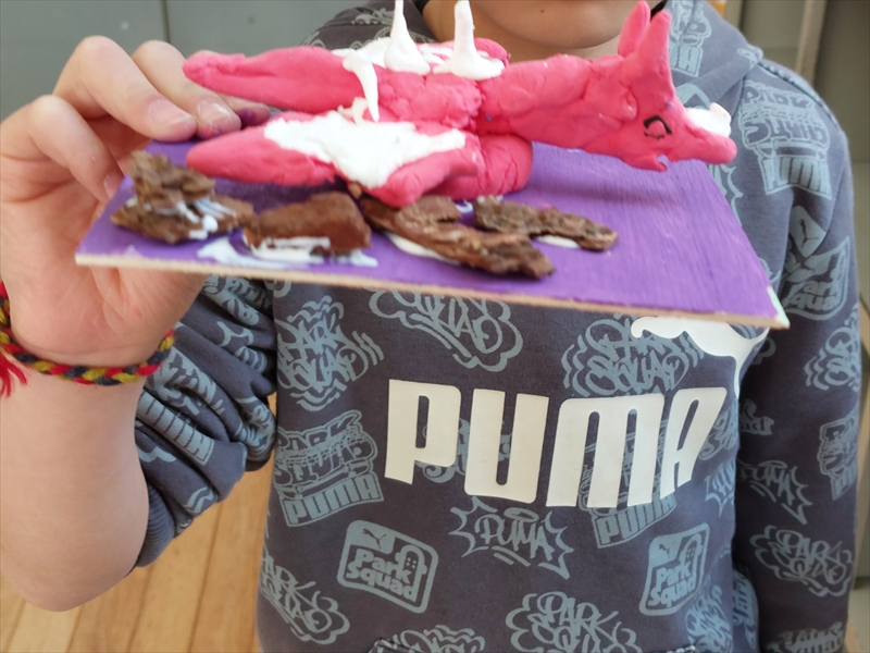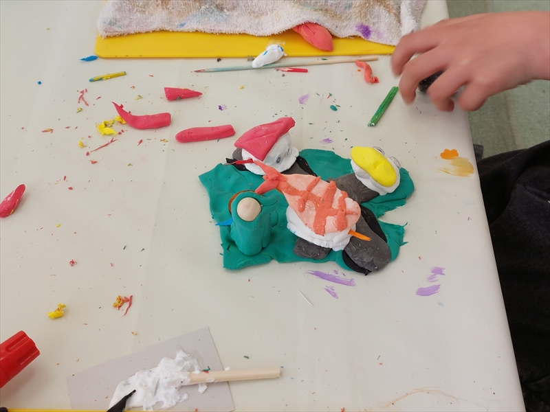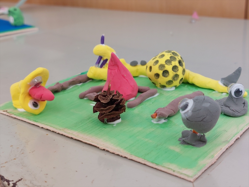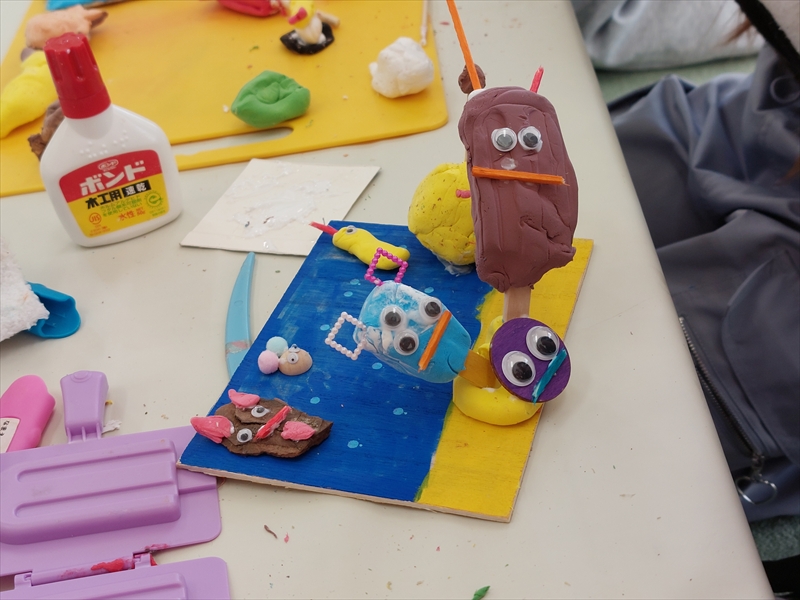 ドラゴンが作りたい、南国ビーチをジオラマ風に表現したい、へんてこなタコのような宇宙人?を作りたい子どももいた。作りたい形がはじめからあるためか、細部に工夫もあったりしてで作品完成が速い子どもも結構いた。