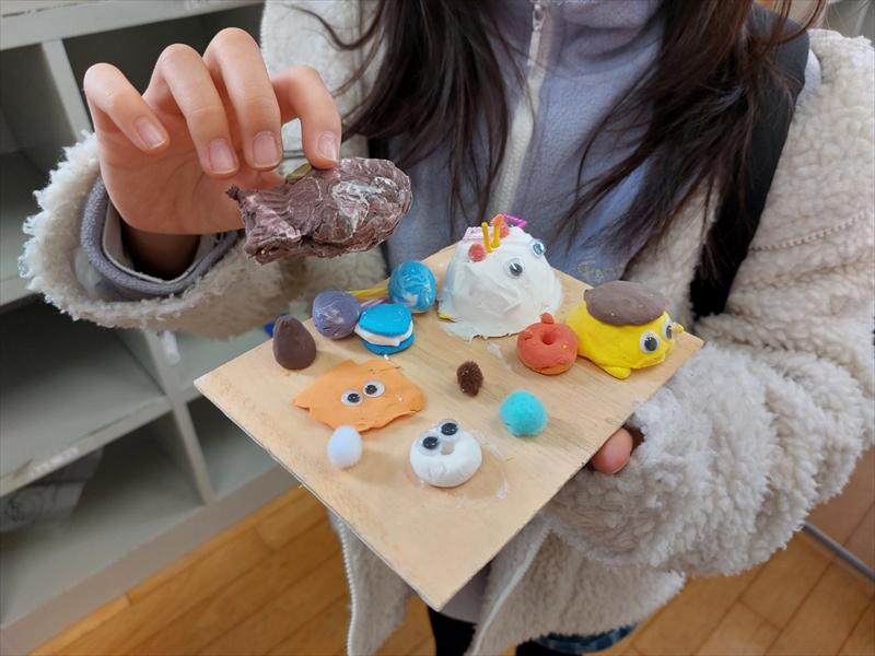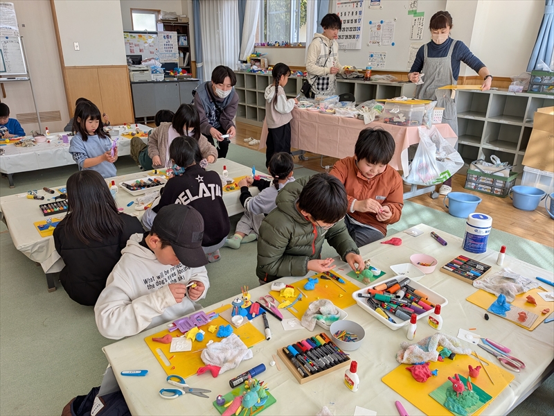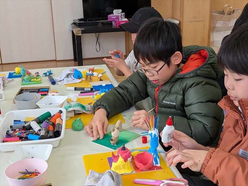 紙粘土ワークショップに去年も参加した子どももいて、「前に作ったやつね、おばーちゃんちに飾ってあるんだよ」と嬉しそうに話してくれた。また別の子はできあがった作品を見て欲しいと児童館本館まで職員を呼びにいったり、さらに迎えに来た保護者を作品を置いた場所まで連れて行ったりしていた。