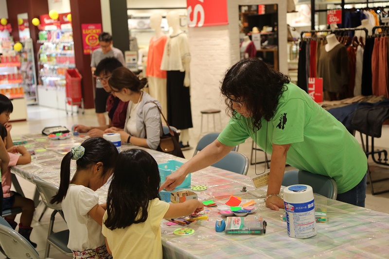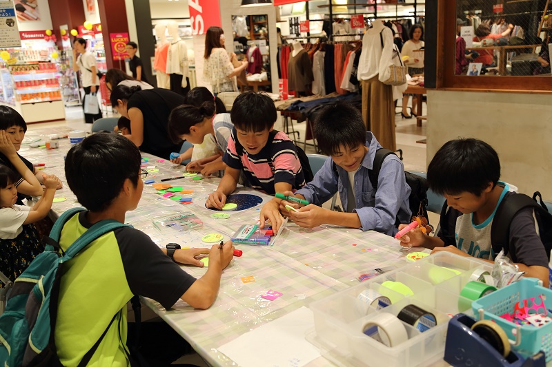 ララガーデン長町ご来場一般参加者には、直径8㎝の蛍光丸形にペンやシールで自由にデコレーションして、オリジナルの星を作って頂きオブジェの外側に描かれた星座にオリジナルの星を張り込み完成させる共同制作ワークショップです。