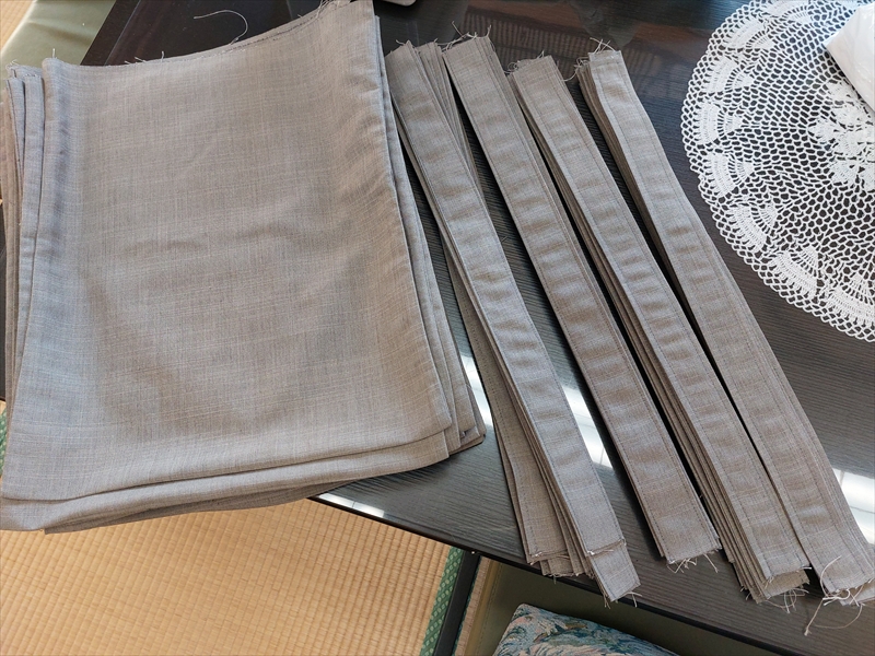 持ち手と袋縫いを21個分完成させ、持ち手と本体部分のアイロンかけをしました。