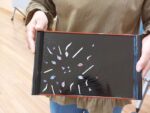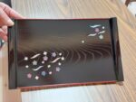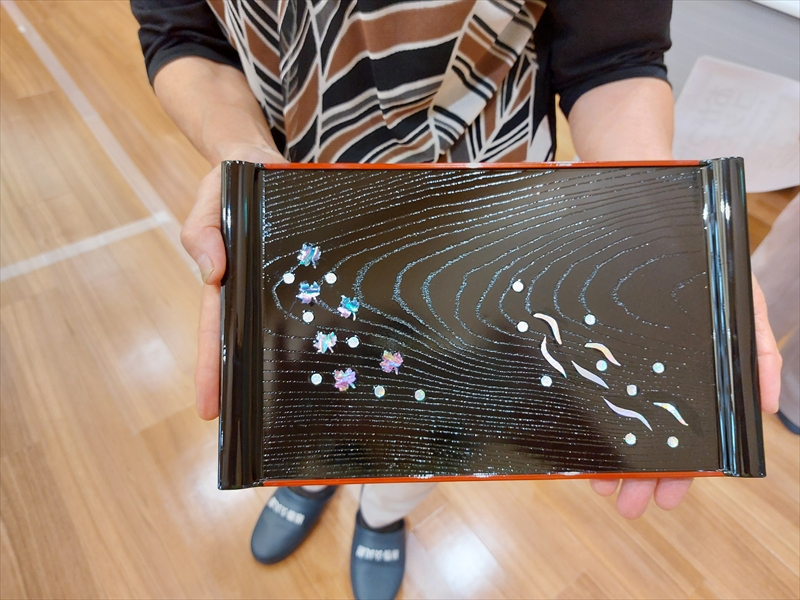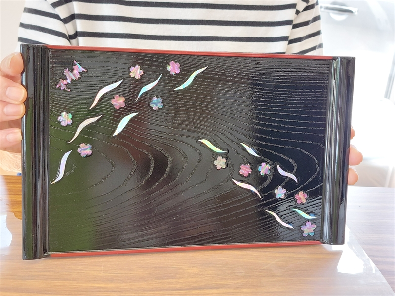 本物の「螺鈿(らでん)」を扱いやすく加工したシールを、漆塗調の手持ち盆に装飾し、作品に仕上げていきます。