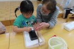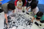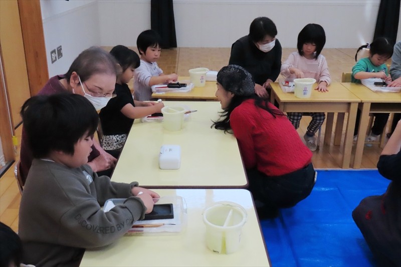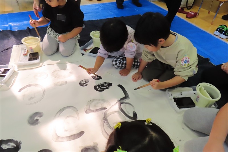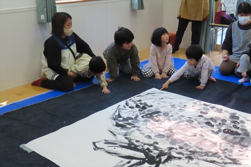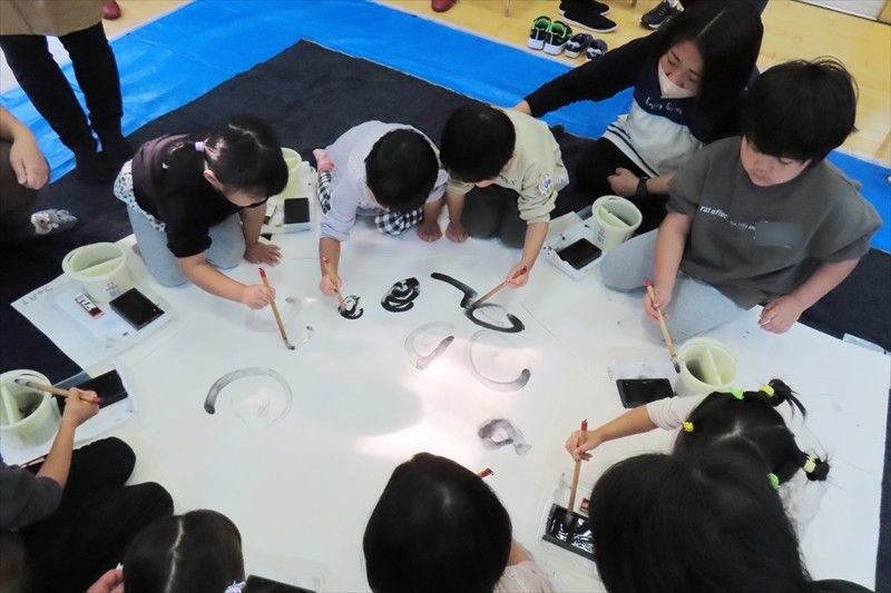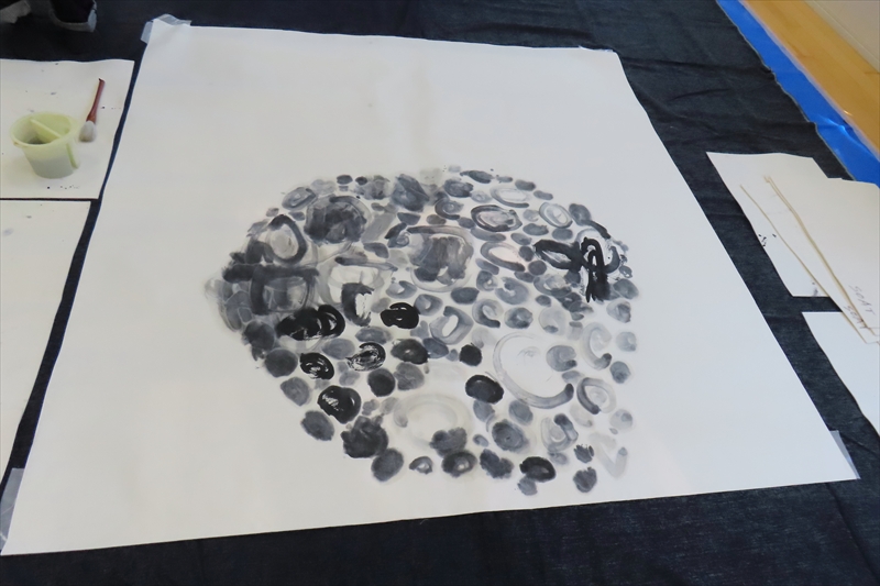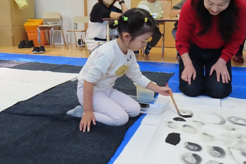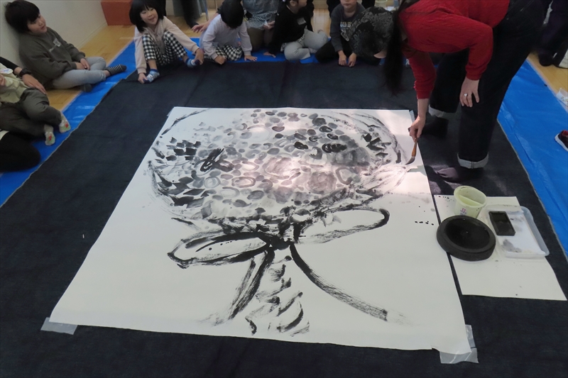 作品のテーマは「花束」です。地域の大人たちが子どもの墨をするサポートを行い、子どもたちが前回体験した「クルクルを円を描く」手法で、たくさんの花を画仙紙に描いていきます。