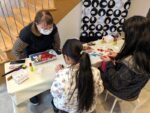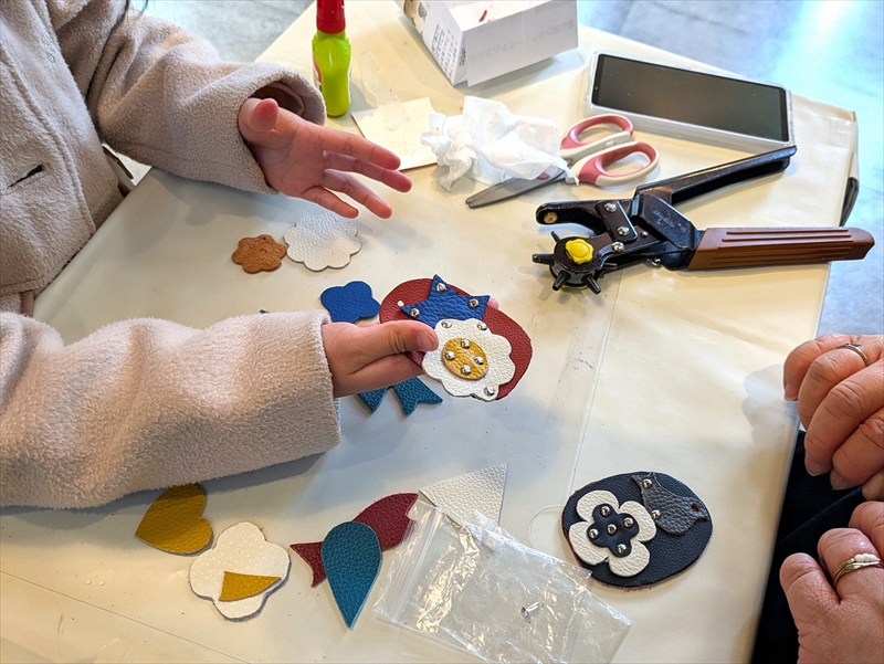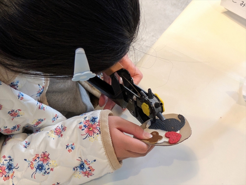 金具を通す穴を開ける作業はすこし力が要りますが、お子さんも積極的に挑戦し、穴が開くと「できた!」と嬉しそうにしていました。